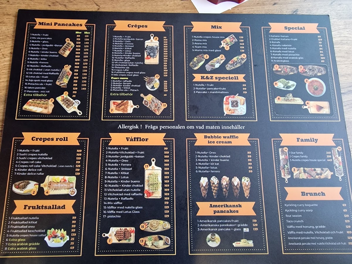 - Bubble Waffle Ice Cream: Crisp waffles bursting with Nutella and Lotus, topped with ice cream and delightful extras (SEK 99.00).
